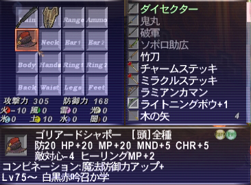 さらにゴリアードシャポー。 毎週固定でやってるナイズルでやっと100層に届き、さらにHNMを倒したら出た一品。 赤の装備で数少ないヒーリングMPが増える装備。MNDやHP、さらにはMPも上がるという一石何鳥だ?と言える良い装備です。まぁWLシャポー+1のが使い勝手は良かったりしますが(´_ゝ`)